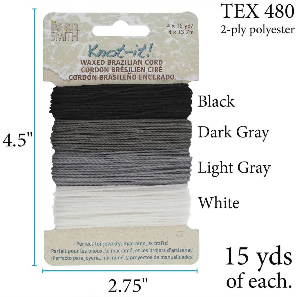 The Beadsmith Knot-it! 100% waxed polyester cord is extremely durable, strong, color fast and water resistant. An artisan cord that knots easily and burns beautifully with a nice finish. Made for macramรฉ but can used for friendship bracelets, knotted jewelry, leather work, basket weaving and much more!