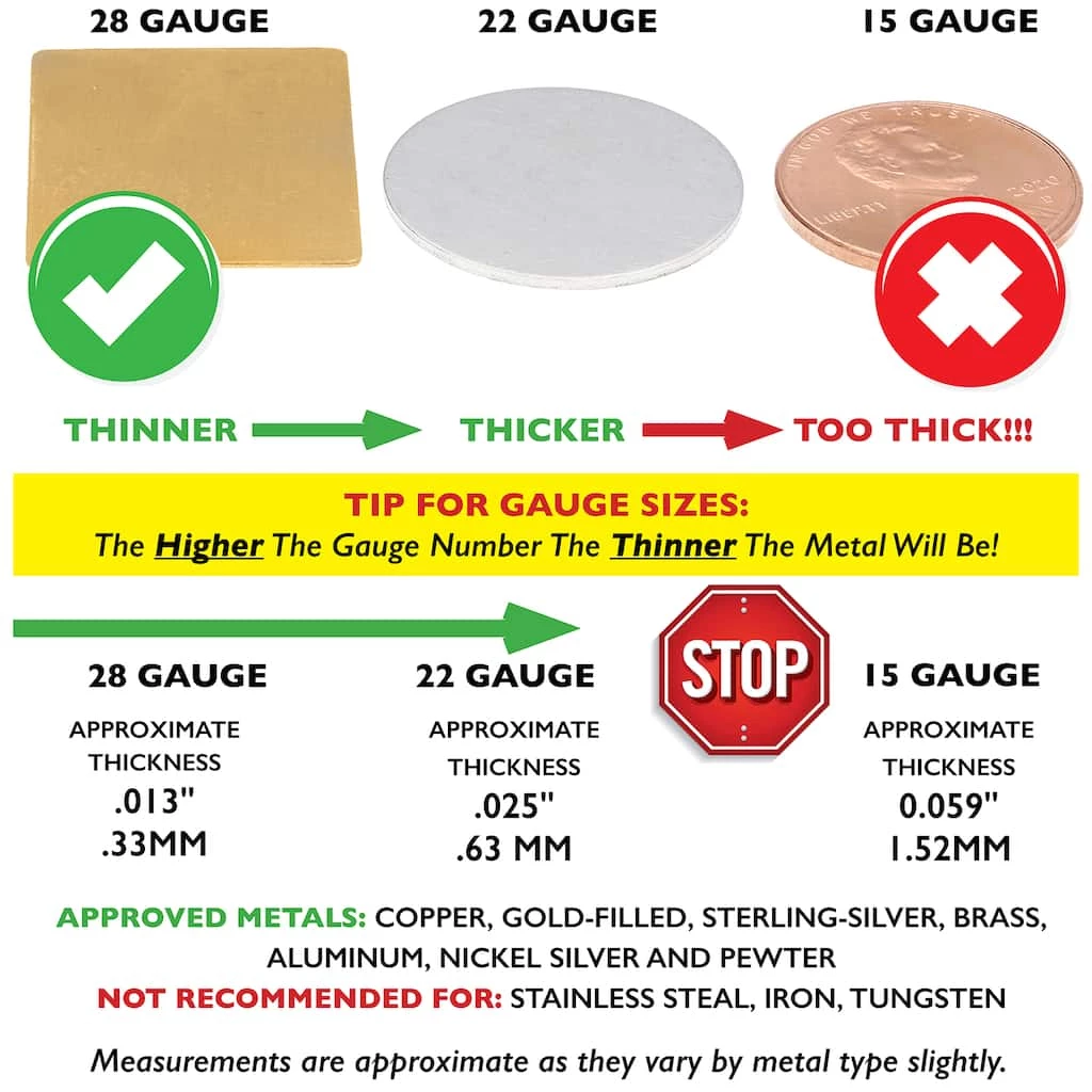 The pliers punch holes in soft sheet metal (copper, gold-filled, sterling silver, and brass) up to 22 gauge. They create a smooth, clean hole without barbs or rough edges. Plus, with the gauge guard, the area around the hole will be free of unsightly scratches.
