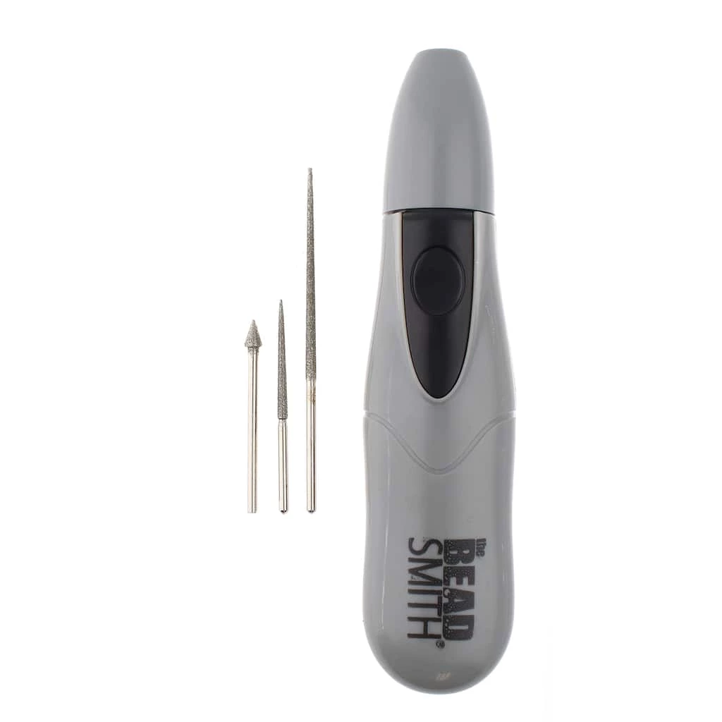 Perfect for softening rough edges of beads, and to smooth and enlarge bead holes. The motor operates at 10,000 rpm. The ergonomic handpiece is lightweight and comfortable. It includes three diamond points: Large and Small Tapered Tips and an Angled Tip. Always use water when cutting with diamond instruments. Runs on two AA batteries (not included).