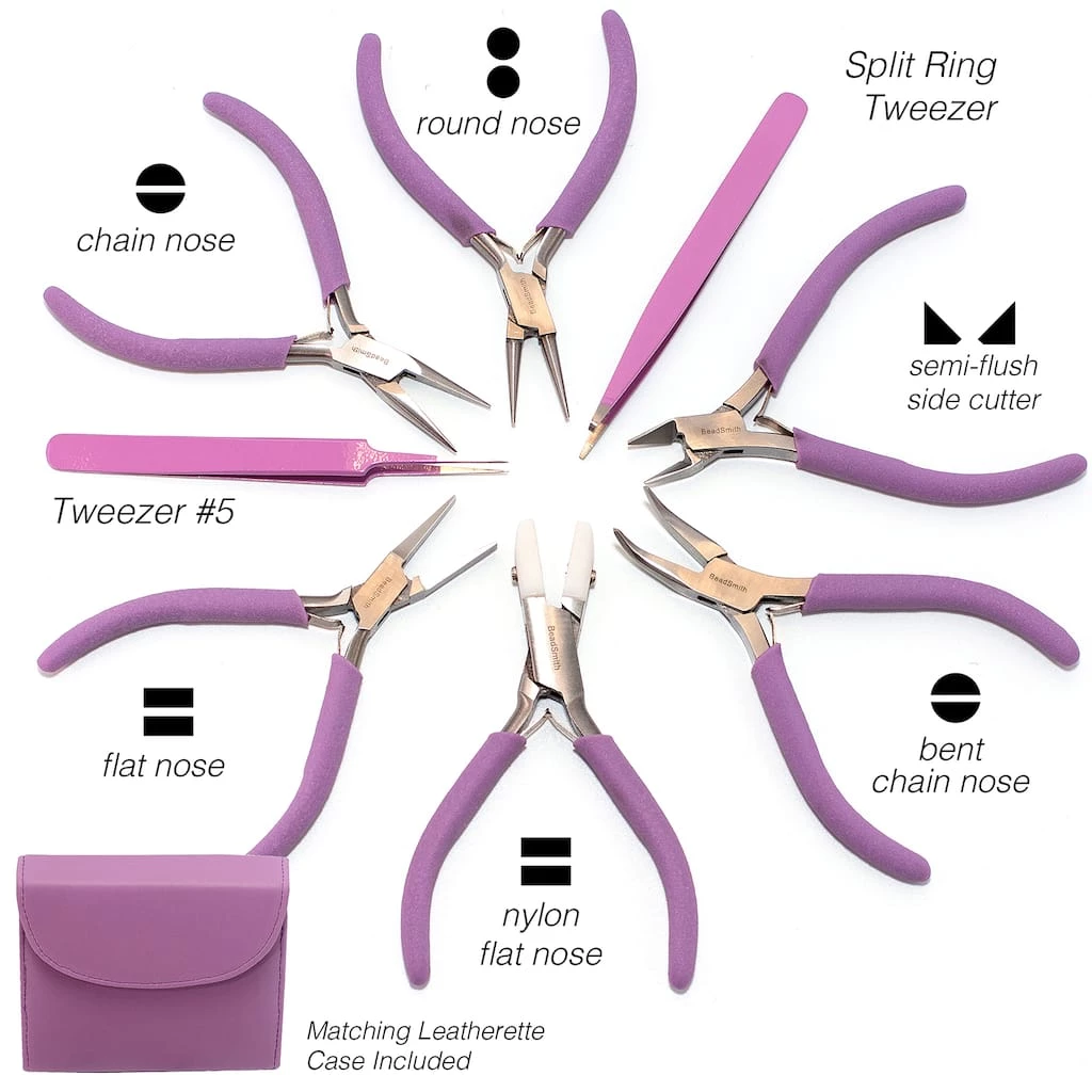 Tools in your Favorite Vibrant Colors! Features 8 fashion-color tools in a color-coordinated clutch⦠Perfect for the style-conscious beader! Each set contains the following tools: Chain Nose Plier; Bent Chain Nose Plier; Flat Nose Plier; Round nose , Cutter, Nylon Jaw Flat knotting Tweezer and split ring Tweezer.