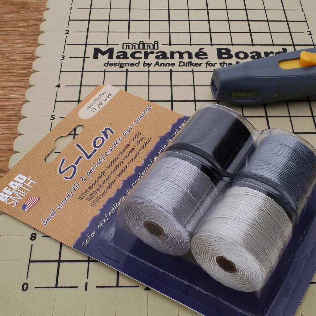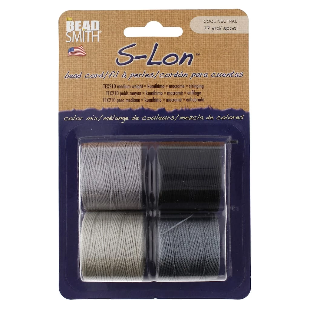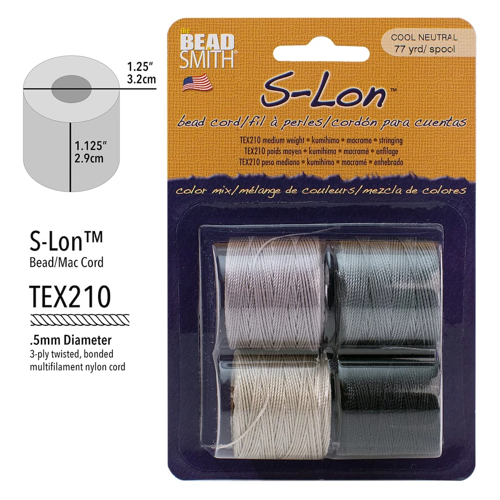 S-Lon bead cord is a 3-ply, twisted and bonded, multifilament nylon cord. Use for 6, 8 and 11/0 seed beads or other beads with at least an 0.8 mm hole. Ideal for use in projects involving kumihimo, macramé & stringing.
